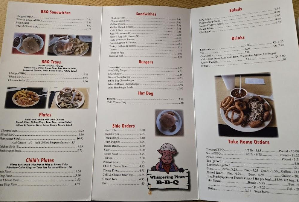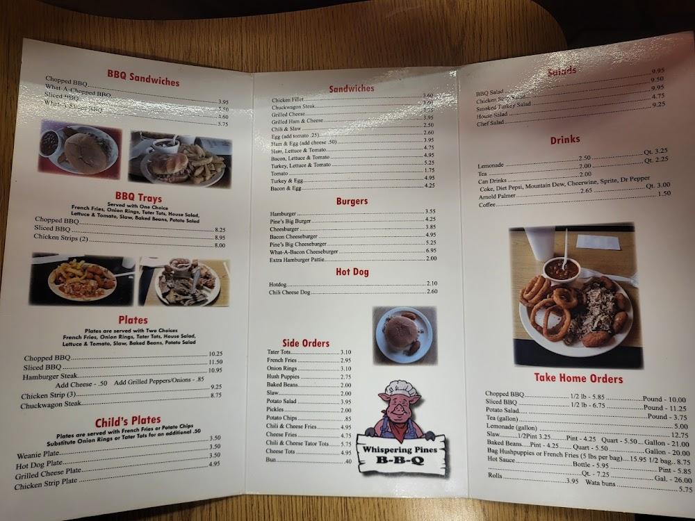 Welcome to Whispering Pines B-B-Q, where flavor meets southern charm in the heart of Albemarle, NC. Located at 1421 US-52, our cozy restaurant is known for its mouth-watering barbecue and locally inspired dishes, perfect for lunch or dinner. Enjoy our extensive selection of teas and indulge in our delightful hushpuppies and savory pulled pork. With accessible seating and amenities, we cater to everyone, including families and solo diners. Whether you dine in, take out, or use our convenient drive-thru service, expect a relaxed atmosphere and exceptional service at prices ranging from $10 to $20. Join us for a meal that feels like home!